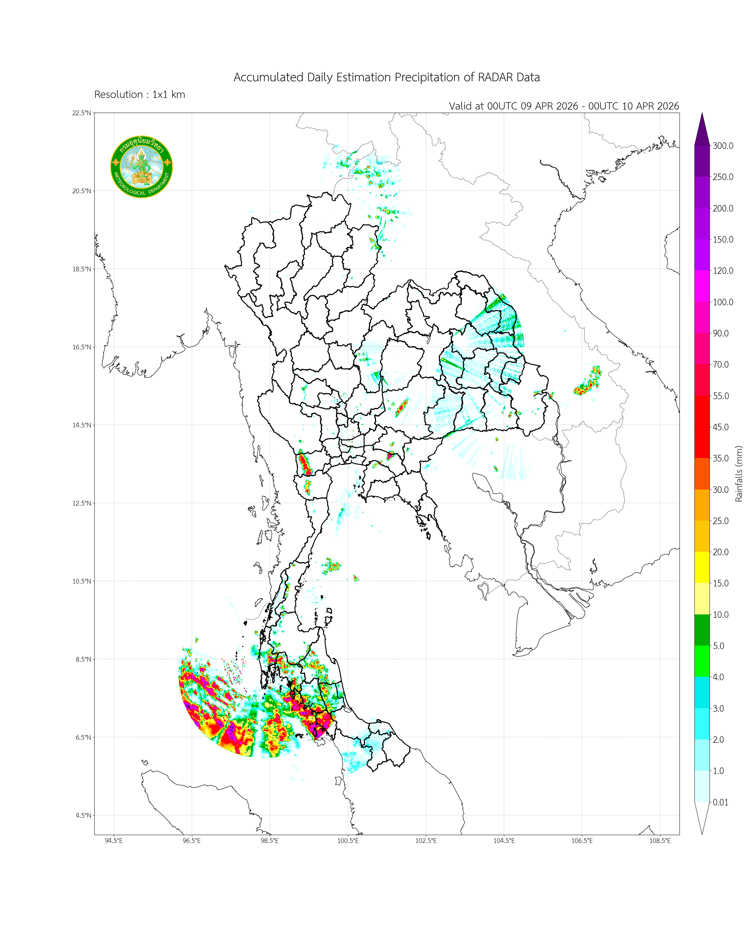 ปริมาณฝนสะสมรายวันจากเรดาร์ตรวจอากาศบริเวณประเทศไทยและใกล้เคียง